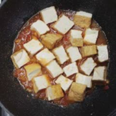 Tiếp theo, cho đậu hũ vào, nấu lim rim nhỏ lửa cho ngấm phần sốt. Dùng đũa trở nhẹ tay miếng đậu hũ. Chú ý không để miếng đậu hũ bị nớt.
