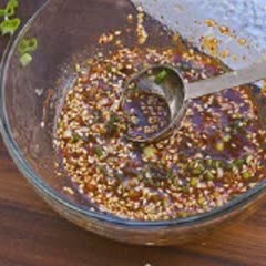 Trong lúc chiên đậu, trong 1 tô nhỏ, cho vào 45ml nước tương nhạt, 5g ớt bột, 1 muỗng cà phê tỏi băm, hành lá cắt nhỏ, 5ml dầu mè và 5g mè rang, khuấy đều.