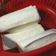 Đậu hũ mua về rửa sạch, để ráo. Sau đó cắt đậu thành từng miếng vuông vức, tạo hình rỗng ở giữa đậu.