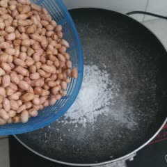 Lựa bỏ hạt đậu hư, rửa sạch với nước và để thật ráo. Bắt 1 cái chảo lên bếp, đun nóng chảo, cho vào chảo 2 muỗng canh muối (mục đích: khi cho muối vào khi rang đậu giúp hạn chế đậu tiếp xúc trực tiếp với đáy chảo gây cháy, nhiệt độ ổn định giúp hạt đậu vàng đều hơn). Cho đậu phộng đã ráo nước vào rang đều tay ở lửa nhỏ.