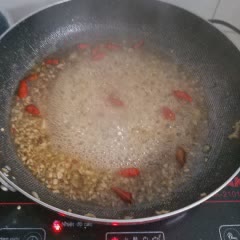 Bật lại bếp, đặt chảo lên bếp làm nóng chảo, cho 4 muỗng canh dầu ăn vào đun nóng, cho tỏi ớt đã băm nhuyễn vào phi vàng. Tỏi vàng thì múc 1/2 ra 1 cái chén nhỏ như hình.