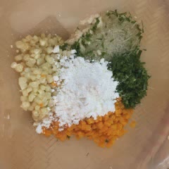 Cho hết các nguyên liệu vào tô, thêm 1 muỗng cà phê muối, 1 muỗng cà phê tiêu, 1 muỗng cà phê đường và bột bắp vào trộn cho quện vào nhau cùng bìa đậu bóp trộn lẫn.