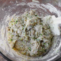 Cho 1 muỗng cà phê bột nở, 1 muỗng cà phê baking soda, 1/4 muỗng cà phê muối vào âu chuối, trộn đều lên. Thêm 180gr bột Bob’s Red Mill 1 to 1 gluten free baking flour, 75gr hạnh nhân, dùng phới dẹt trộn đều lên. Cho bí ngòi bào sợi vào trộn đều lần nữa cho bí quyện đều cùng bột.
