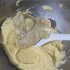 Rây 105g bột mì và 2g bột nở vào thố bơ, dùng phới dẹp trộn đều. Sau đó cho tiếp chuối nghiền vào, trộn cho quyện đều.