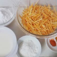 Thái khoai lang thành sợi ngâm với nước muối loãng, sau đó rửa lại sạch và để ráo nước.
