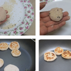 Nặn bánh thành từng viên tròn, nhỏ, ấn dẹp. Rắc mè lên bề mặt bánh sao cho dính vào bánh, chiên vàng giòn 2 mặt với dầu ăn.
