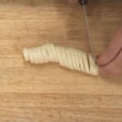 Cuộn bánh mì lại thành cuộn tròn, có thể dùng tăm cố định 2 đầu để cuộn bánh không bị tuột. Dùng kéo cắt phần tăm thừa 2 đầu. Trứng đánh đều trong bát, nhúng cuộn bánh mì vào bát trứng sao cho trứng dính đều ngoài vỏ cuộn bánh.