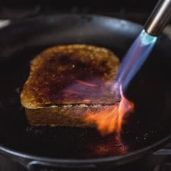 Tắt lửa bếp đi, bạn cho 1/2 đường lên bánh mì, dùng dụng cụ khò lửa và khò cho đến khi đường tan chảy và nâu vàng. lặp lại với lượng đường còn lại và mặt còn lại của bánh mì.