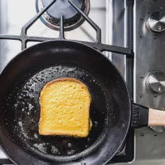 Đánh tan trứng gà với 1 muỗng canh kem vani, nhúng bánh mì vào hỗn hợp trứng gà đều cả 2 mặt. Nhanh chóng bắc chảo lên bếp, cho bơ vào đun nóng và thả bánh mì vòa chiên chín vàng.