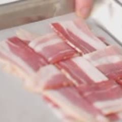 Cắt đôi miếng thịt xông khói. Đặt 3 dải thịt song song với nhau trên khay nướng có lót giấy nến. Gập nửa trên miếng thịt ở giữa lại, đặt 1 dải thịt khác nằm bắc qua 2 dải thịt còn lại. Tiếp theo, gập nửa dưới miếng thịt ở giữa và thực hiện như trên, sao cho các dải thịt đan xen như đan quạt nan.