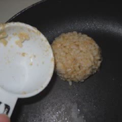Trong 1 cái tô, trộn đều tinh chất va ni, cơm, trứng gà, bột quế lại với nhau. Bắc 1 cái chảo lên lên bếp, đun nóng rồi múc hỗn hợp cơm vào, dùng vá ấn dẹp xuống và áp chảo.