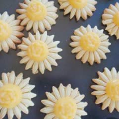 Cán mỏng phần bột dùng để làm khuôn bông hoa. Sau đó cắt bột và xếp lên khay. Bật lò 170 độ C trước 10 phút. Sau đó cho khay bánh vào ngăn giữa lò nướng 15-17 phút là bánh chín. Lấy khay bánh ra để nguội.
