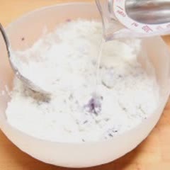 Trộn đều khoai lang tím với 100gr bột mì, 2gr muối, 100ml nước ấm trong tô thành một hỗn hợp mềm, mịn.
