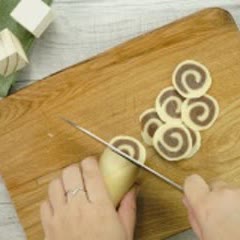 Cuộn chặt tay thành cuộn tròn. Gói lại vào nylon và cho vào tủ mát khoảng 2 tiếng để bột cứng lại dễ cắt hơn.