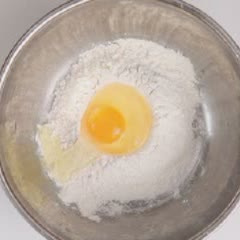 Bột mì cho ra tô cùng trứng gà, muối, rượu trắng và 1/2 chén nước, trộn đều. Sau đó, thêm tôm, cà rốt vào cùng.