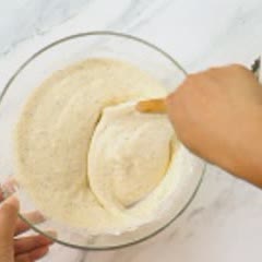 Đánh hỗn hợp trứng ấm đến khi bông mịn, nhấc que thấy hỗn hợp kéo sợi ruy băng là được. Rây vào đây 100gr bột mì số 8 (cake flour), 4gr trà Earl grey rồi dùng phới trộn nhẹ nhàng và dứt khoát. Đến khi thấy bột và hỗn hợp trứng hòa quyện vào nhau là được.