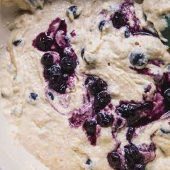 Trong 1 cái tô, trộn đều sữa tươi, trứng gà, mật ong, bơ, tinh chất vani lại với nhau. Kế tiếp cho bột mì, bột nở, muối vào, đánh đều cho hòa quyện. Cho việt quất tươi vào tiếp tục trộn đều, nếu cần thiết, bạn có thể cho thêm 1-2 muỗng canh mứt việt quất vào.