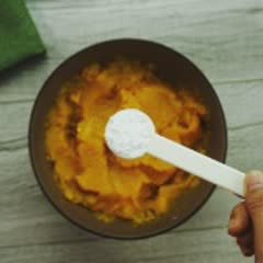 Sau đó dùng muỗng tán nhuyễn bí đỏ ra, thêm vào tô bí đỏ 40gr bột năng, 1/2 muỗng cà phê muối, 15gr phô mai Parmesan bào. Lại tiếp tục dùng muỗng trộn đều hỗn hợp lên.
