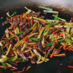 Tiếp theo, thêm cần tây và thịt bò đã nấu chín. Bật lửa cao và dùng vá gỗ đảo đều trên chảo. Nhanh chóng cho rượu Thiệu Hưng, đường, nước tương, dầu mè, ớt khô và hành lá vào. Xào hỗn hợp trong vòng 1 phút cho đến khi các gia vị hòa quyện vào nhau. Nếm thử vừa miệng thì tắt bếp.