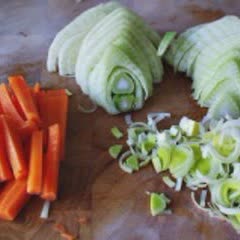 Cắt nhuyễn cần tây và cắt sợi cà rốt, cắt khúc hẹ.