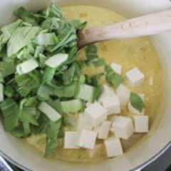 Sau đó bạn cho bột cà ri vào tiếp tục xào rồi đổ nước dùng rau củ vào cùng nước cốt dừa vào đun sôi, cho đậu hũ và cải thìa vào, nhẹ nhàng đảo rồi để cho nồi cà ri sôi trở lại, nêm muối là hoàn thành.