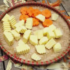 Cà rốt, khoai tây và khoai lang nạo bỏ vỏ, rửa sạch, thái miếng. Ngâm khoai tây và khoai lang vào bát muối loãng cho khoai ra nhựa và khỏi thâm, sau đó vớt ra để ráo nước.