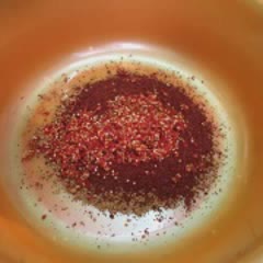 Chuẩn bị 1 cái thau lớn: Chia tất cả các nguyên liệu và gia vị làm đôi hết nhé, cho 2 lần trộn. Lần đầu, cho 1/2 các nguyên liệu : Ớt bột, ớt tươi, gừng, tỏi, sả, muối tôm vào trước.