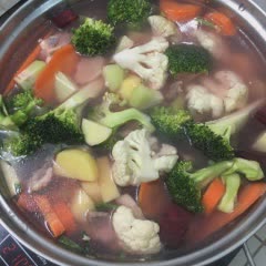 Thịt heo rửa sạch, chặt khúc. Khoai tây, cà rốt, bông cải, củ dền rửa sạch cắt nhỏ.