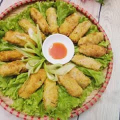 Chả giò hải sản chiên xù béo thơm, giòn rụm vỏ bánh tráng, bao lấy nhân tôm, thịt và mực cùng các rau củ phụ liệu và ít gia vị. Có thể chấm ăn kèm với tương ớt cay thơm rất ngon.