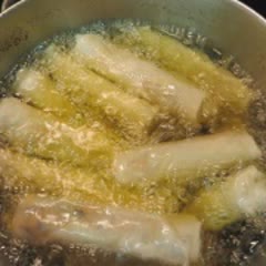 Làm nóng dầu ăn trong chảo, cho chả giò vải vào, chiên vàng giòn. Thỉnh thoảng lật đều để chả giò không bị cháy.