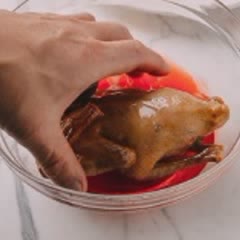 Hòa tan phần hỗn hợp nước sốt gồm: 2 muỗng canh mạch nha, 5ml giấm,1 thìa cà phê rượu, 10ml nước. Nhúng đều con chim vào phần nước sốt này sao cho nước sốt bao trọn khắp mình chim câu.