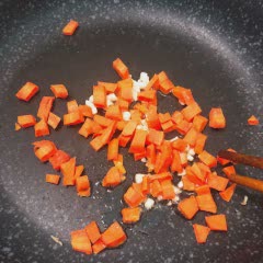 Cho 1 muỗng canh dầu ăn, tỏi phi thơm, cho cà rốt vào, cho 1 muỗng canh nước lọc, cho thịt bò băm vào chảo, dùng đũa đảo đều.