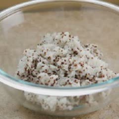 Cho 2 chén cơm vào tô, thêm vào tô cơm 1/2 muỗng cà phê mè đen đã rang chín. Trộn đều.