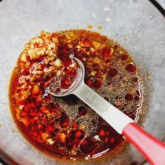 Làm sốt dầu ớt trong thời gian chờ dưa leo. Lột vỏ tỏi, băm nhuyễn. Cho tỏi băm, 1 muỗng cà phê đường, 2 muỗng canh giấm gạo, 1/4 muỗng cà phê tiêu, 1 muỗng canh nước tương, 2 muỗng cà phê dầu ớt và khuấy đều lên. Lấy dưa leo ra cho ráo bớt nước và thấm khô. Cho dưa vào tô khác, rưới toàn bột nước sốt dầu ớt lên và trộn thật đều là xong rồi đó.
