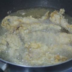 Đun nóng 200 ml dầu ăn rồi cho ếch đã tẩm vào chiên ngập trong dầu cho đến khi ếch chín vàng giòn thì vớt ra để ráo dầu.
