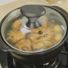 Tiếp theo, đổ 150ml nước dừa vào cùng, nấu nhỏ lửa cho thịt gà mềm, cho trứng cút vào, nấu thêm 10 phút.