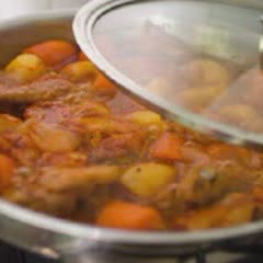 Thì cho cà rốt, khoai tây và hành tây đã cắt khúc vừa ăn vào. Đậy nắp vung đun tiếp đến khi cà rốt, khoai tây chín mềm.