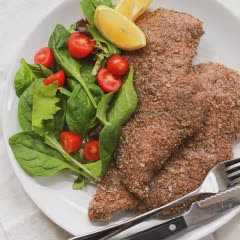 Bật trước lò nướng ở 350 độ F. Xịt dầu dừa lên khay nướng và để sang 1 bên. Xay nhuyễn hạt hồ đào trong máy xay thực phẩm rồi trộn cùng tỏi băm khô, ngò tây băm khô, trứng gà đánh tan trong một cái tô khác.