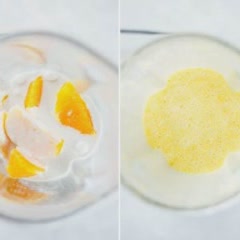 Cam thái múi cau rồi bóc vỏ, loại bỏ hạt nếu có. Cho múi cam vào máy xay sinh tố cùng 2/3 lượng nước cốt dừa, mật ong. Bật công tắc xay nhuyễn hỗn hợp. Rót sinh tố cam vào khuôn kem, cho vào ngăn đá khoảng 3 tiếng, sau đó bạn lấy ra, rót 1/3 lượng nước cốt dừa vào khuôn, cho tiếp kem vào ngăn đá cho đến khi đông.