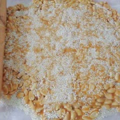 Đổ kẹo đậu phộng ra khay đã phủ sẵn mè rang. Sau đó rắc tiếp mè còn lại lên, dùng cán, cán kẹo mỏng ra. Tranh thủ kẹo còn hơi nóng cắt kẹo thành những miếng nhỏ vừa ăn.