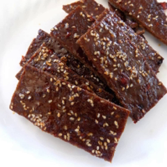 Cho thịt lên giấy chống dính (giấy dầu), rồi đậy lên thịt 1 miếng giấy dầu khác, dùng cây cán, cán thịt thành 1 lớp mỏng. Sau đó rắc mè lên mặt. Bây giờ quét 1 lớp nước mật ong lên mặt thịt. Cách này giúp thịt có màu sáng đẹp.