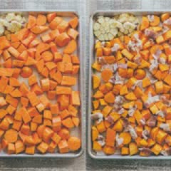 Mở lò nướng trước 10 phút ở 200 độ C. Trải đều khoai lang lên khay nướng cùng với tỏi, thịt xông khói. Cho khay vào lò nướng 20 phút rồi lấy ra đảo đều khoai và cho vào nứng lại thêm 25 - 30 phút nữa đến khi khoai chín thơm, thịt xông khói giòn là lấy ra được rồi nha.