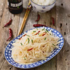Đun nóng dầu ăn, cho ớt khô và gừng băm vào xào đến khi ớt chuyển sang màu đỏ sậm, cho khoai tây vào xào trong 1 phút. Nêm muối, giấm táo vào đảo đều tay, xào thêm vài phút nữa thì tắt bếp.