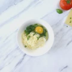 Cho 150gr phô mai Ricotta vào tô lớn, tiếp theo cho vào 50gr phô mai Parmesan, 30gr lá ngò tây (parsley), 30gr lá húng quế tây (basil) và 1 quả trứng gà. Trộn đều cho các nguyên liệu hòa quyện với nhau.