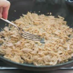 Sau đó cho cá ngừ hộp vào, dùng nĩa đè xuống, trải đều ra, cho muối vào cho vừa ăn, sau đó vặn nhỏ lửa xuống, tiếp tục đun cá ngừ, nếu thấy khô thì bạn cho 1 chén nước vào nhé.