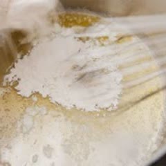Đun chảy bơ trong nồi sạch, thêm 45g bột mì vào rồi khuấy đều cho đến khi hỗn hợp chuyển màu nâu. Sao đó đổ từ từ phần sữa nóng vào, vừa đổ vừa đánh đều.