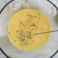 Chuẩn bị nguyên liệu. Trứng gà đánh tan, sau đó cho muối tiêu vào đánh đều, để riêng. Trong 1 cái chảo, bạn cho bơ vào đun chảy, sau đó cho ớt chuông, hành lá băm, thịt nguội vào xào chín sơ.