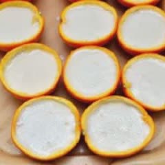 Đổ phần nước rau câu ở trên vào ½ vỏ cam đã chuẩn bị sẵn, sau đó đặt vào trong ngăn mát tủ lạnh 2-3 tiếng để rau câu đông lại.