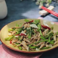 Thịt lợn thái sợi cho vào bát, thêm một ít hạt tiêu, nước tương và một ít bột bắp vào trộn đều. Đun nóng dầu ăn trong chảo, cho thịt vào xào.