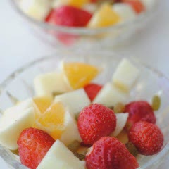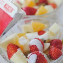 Cho cam, dâu, táo, nho khô vào tô. Rưới sữa chua lên và trộn đều. Lượng sữa chua tùy thuộc vào khẩu vị của bạn nhé! Bạn có thể cho salad vào tủ lạnh để ăn ngon hơn.